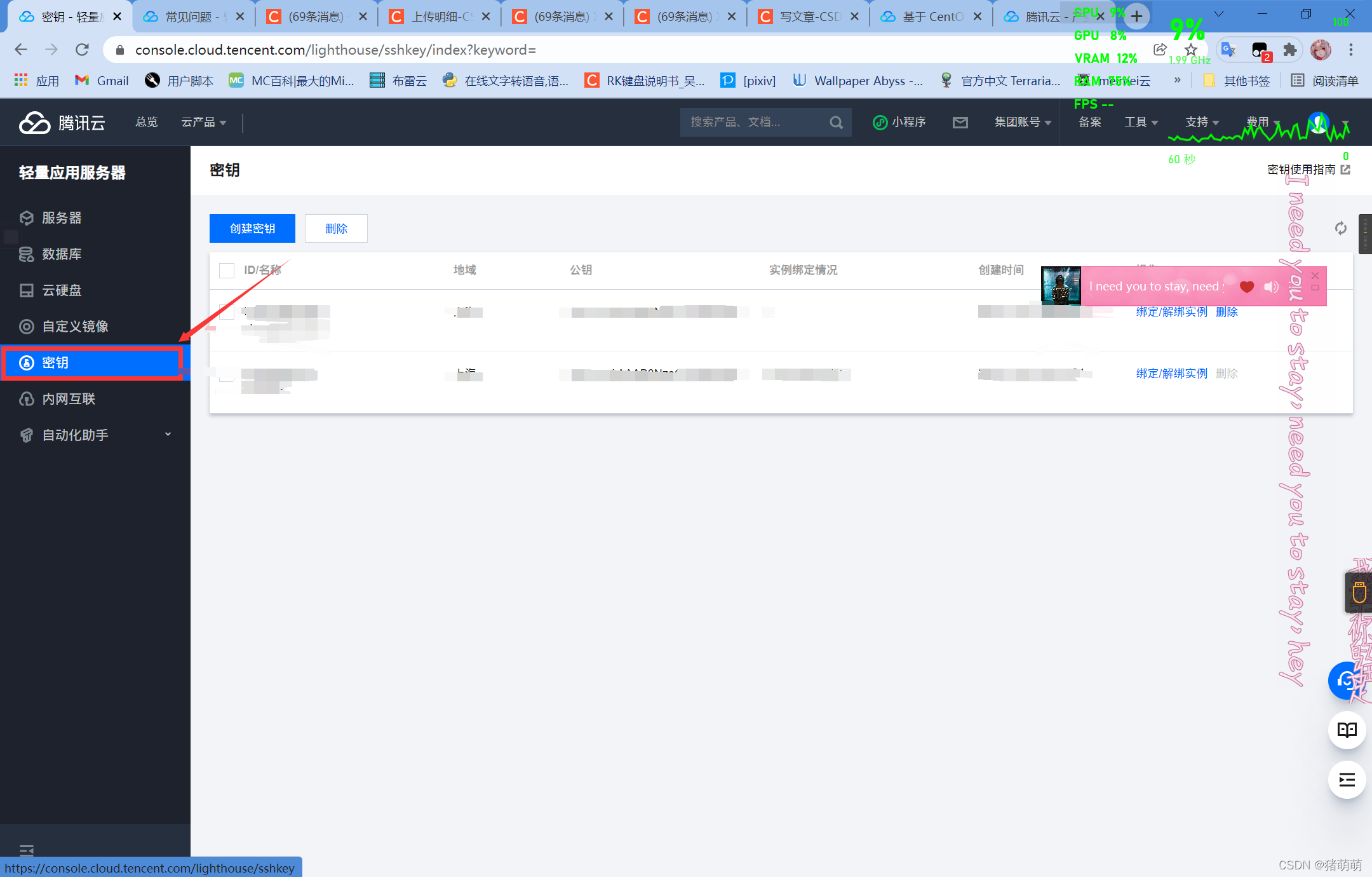 我这里已经创建了2个密钥,创建一个密钥并下载该密钥,随后则将密钥绑定到服务器上。
